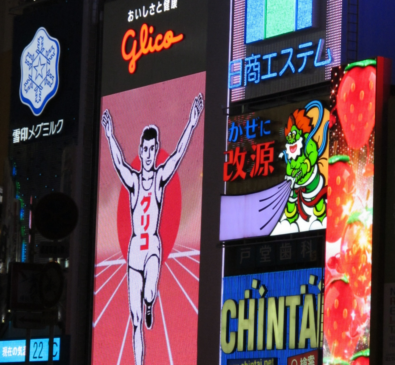 달리는 남성 모습을 표현한 제과업체 에자키 글리코의 간판은 오사카의 대표적인 명물로 많은 관광객들이 이곳을 찾아 사진을 찍는다. 인근 가출 청소년 집결지인 구리시타를 찾는 청소년들이 종종 사건·사고에 연루돼 일본의 사회적 문제로 떠올랐다.
