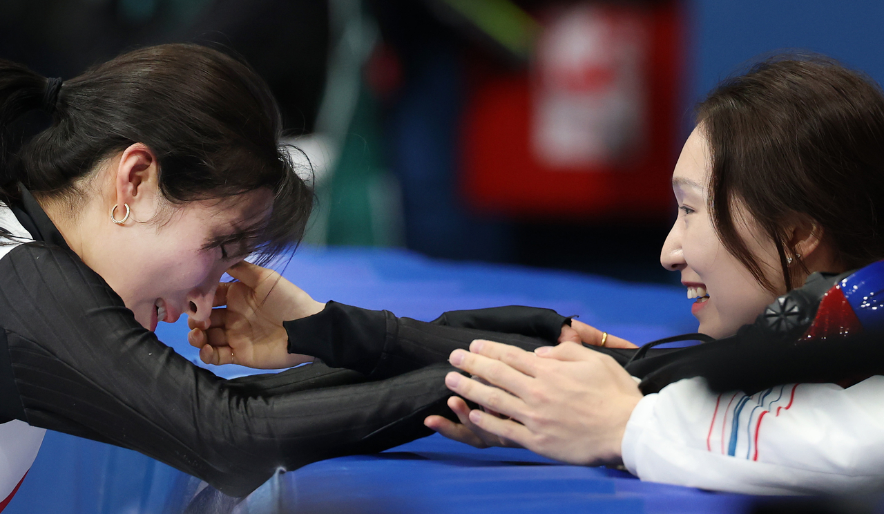 | 16일(현지시간) 이탈리아 밀라노 아이스스케이팅 아레나에서 열린 2026 밀라노-코르티나 동계올림픽 쇼트트랙 여자 1000m 결승에서 3위로 동메달을 따낸 김길리(왼쪽)가 최민정의 축하를 받고 있다. [연합] |