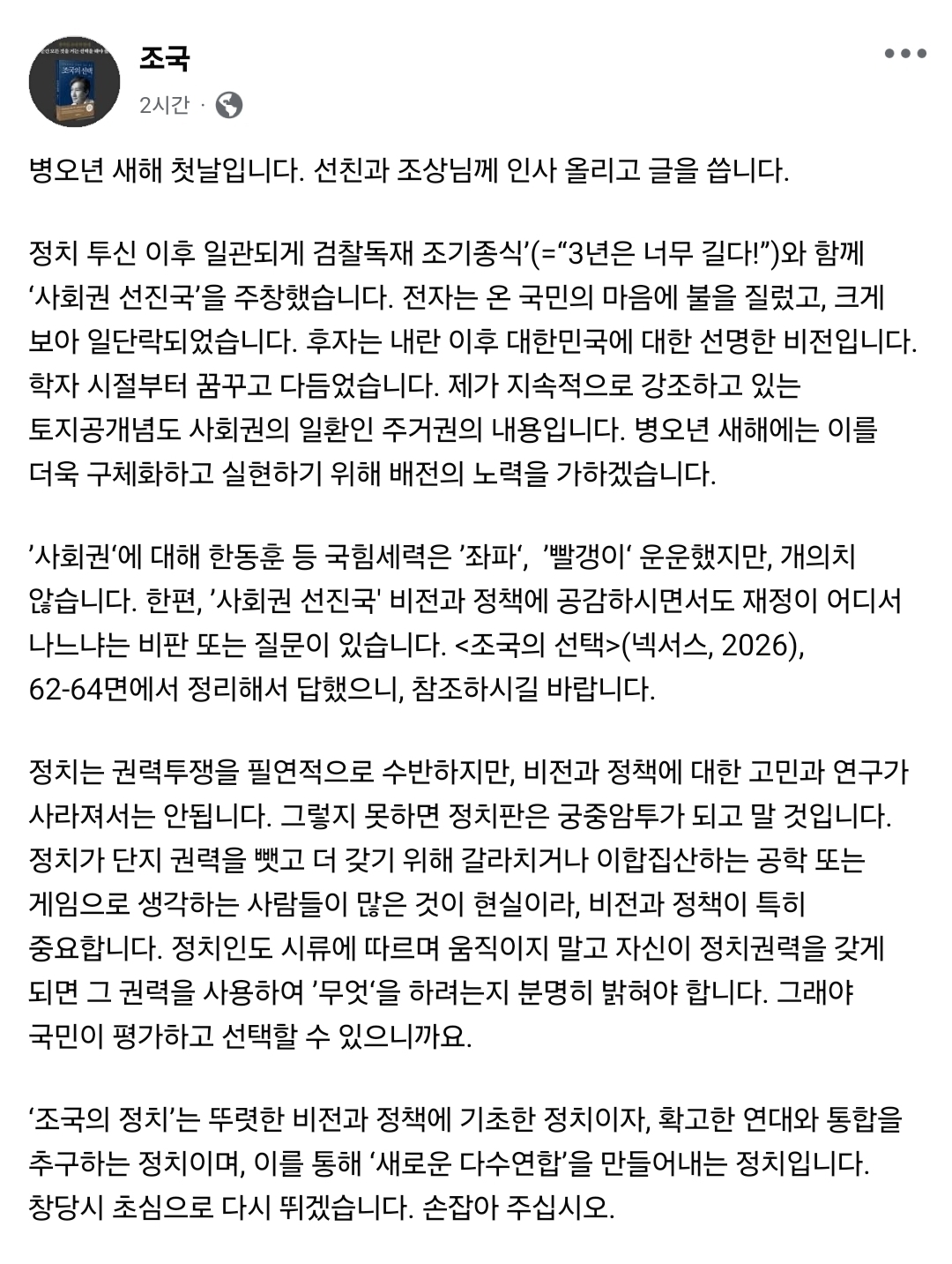 조국 대표는 이날 자신의 사회관계망서비스(SNS) 페이스북에 “정치 투신 이후 일관되게 검찰독재 조기종식’(구호)과 함께 ‘사회권 선진국’을 주창했다”며 “전자는 온 국민의 마음에 불을 질렀고, 크게 보아 일단락됐다. 후자는 내란 이후 대한민국에 대한 선명한 비전”이라고 강조했다.
