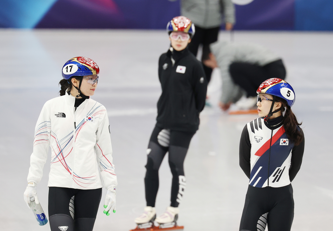 | 2026 밀라노-코르티나담페초 동계올림픽 밀라노 아이스스케이팅 아레나에서 한국 쇼트트랙 심석희(왼쪽)와 최민정이 훈련 중 대화하고 있다. [연합] |
