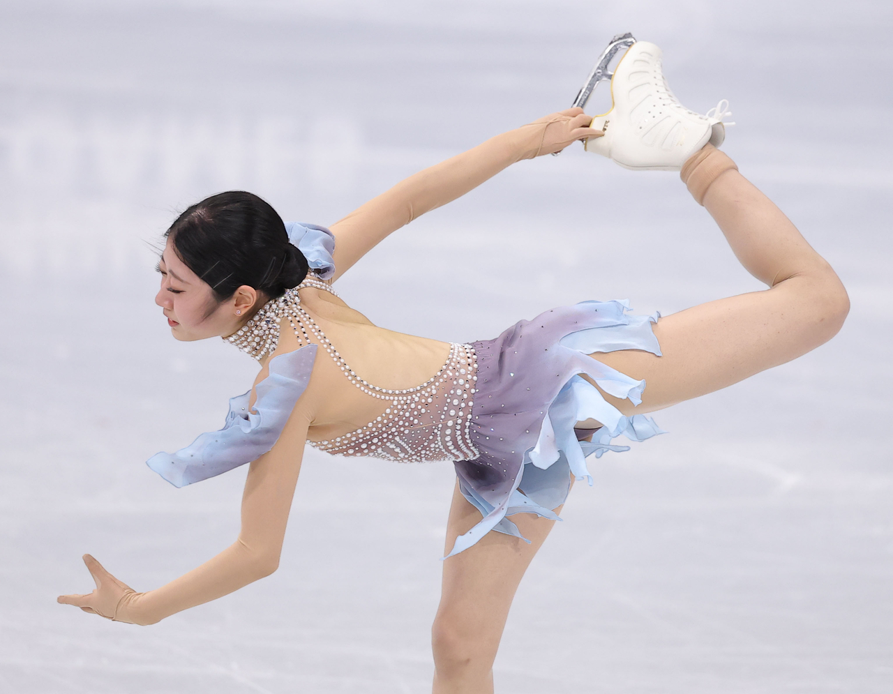 | 18일 이탈리아 밀라노 아이스스케이팅 아레나에서 열린 2026 밀라노-코르티나 동계올림픽 여자 싱글 쇼트 프로그램에 출전한 신지아가 연기를 펼치고 있다. [연합] |