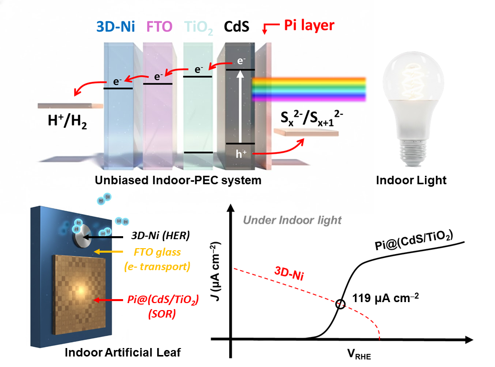 황화물은 강한 빛에 노출되면 ‘광부식’ 현상이 일어나는데 약한 실내 조명은 이를 최소화할 수 있다. 연구팀은 빛이 약해 줄어든 전하 입자량을 보완하기 위해 황화물에 이산화티타늄이 접합된 전극 구조를 설계했다. 이 접합 구조는 양전하 입자와 음전하 입자가 재결합해 사라지는 것을 막아 한정된 전하를 재결합 손실 없이 온전히 수소 생산에 쓰게 만든다. 또 황화물 표면에 ‘인산염(Pi)’을 코팅함으로써 황화물의 광부식은 막고 전하 이동 속도는 높여, 내구성과 효율을 동시에 잡았다.