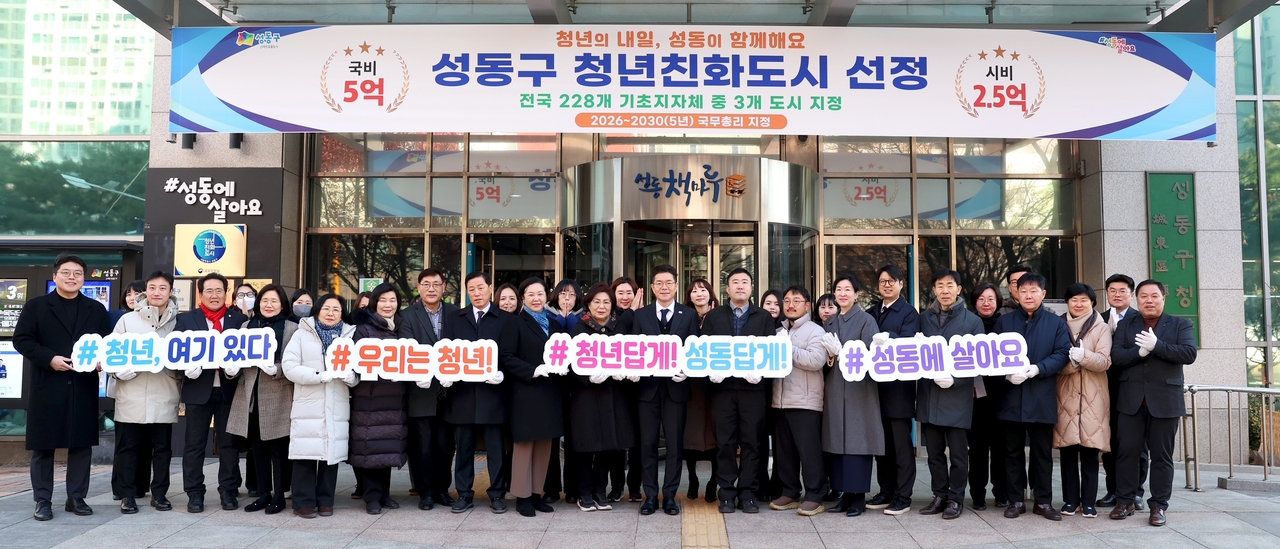 | 많은 사람들이 ‘#청년, 여기 있다’, ‘#우리는 청년’, ‘#청년답게 성동답게’, ‘#성동에 살아요’가 쓰여진 피켓을 들고 서 있는 사진이다. 건물 외벽에는 ‘성동구 청년친화도시 선정 전국 228개 기초지자체 중 3개 도시 선정’이라는 문구가 적혀 있다. |