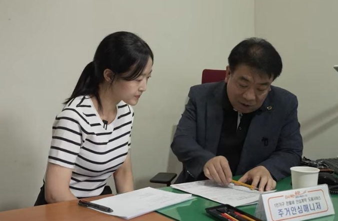 | 책상에 앉아 서류를 검토하는 듯한 표정을 짓고 있는 여성과 남성이 마주보고 있는 사진이다. 테이블 위에 ‘2024년 전월세 안심계약 도움서비스, 주거안심매니저’라고 적힌 안내문이 놓여 있다. |
