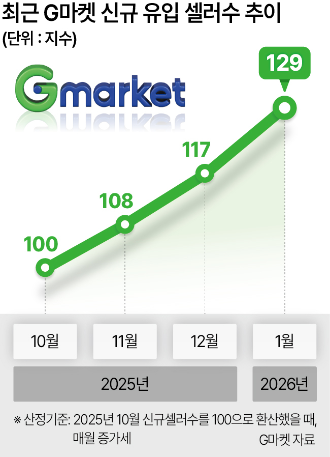 G마켓에 따르면 최근 3개월간 신규 입점 셀러 수는 꾸준히 증가했다. 지난해 10월 신규 셀러 수를 100으로 환산했을 때 11월 108, 12월 117, 2026년 1월 129로 상승 곡선을 그렸다.