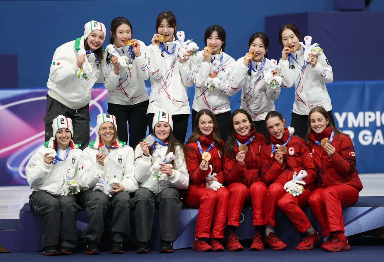 | 여자 3000m 계주 결승에서 금메달을 따낸 한국 선수들이 메달을 목에 걸고 메달리스트들과 함께 포즈를 취하고 있다. [연합] |