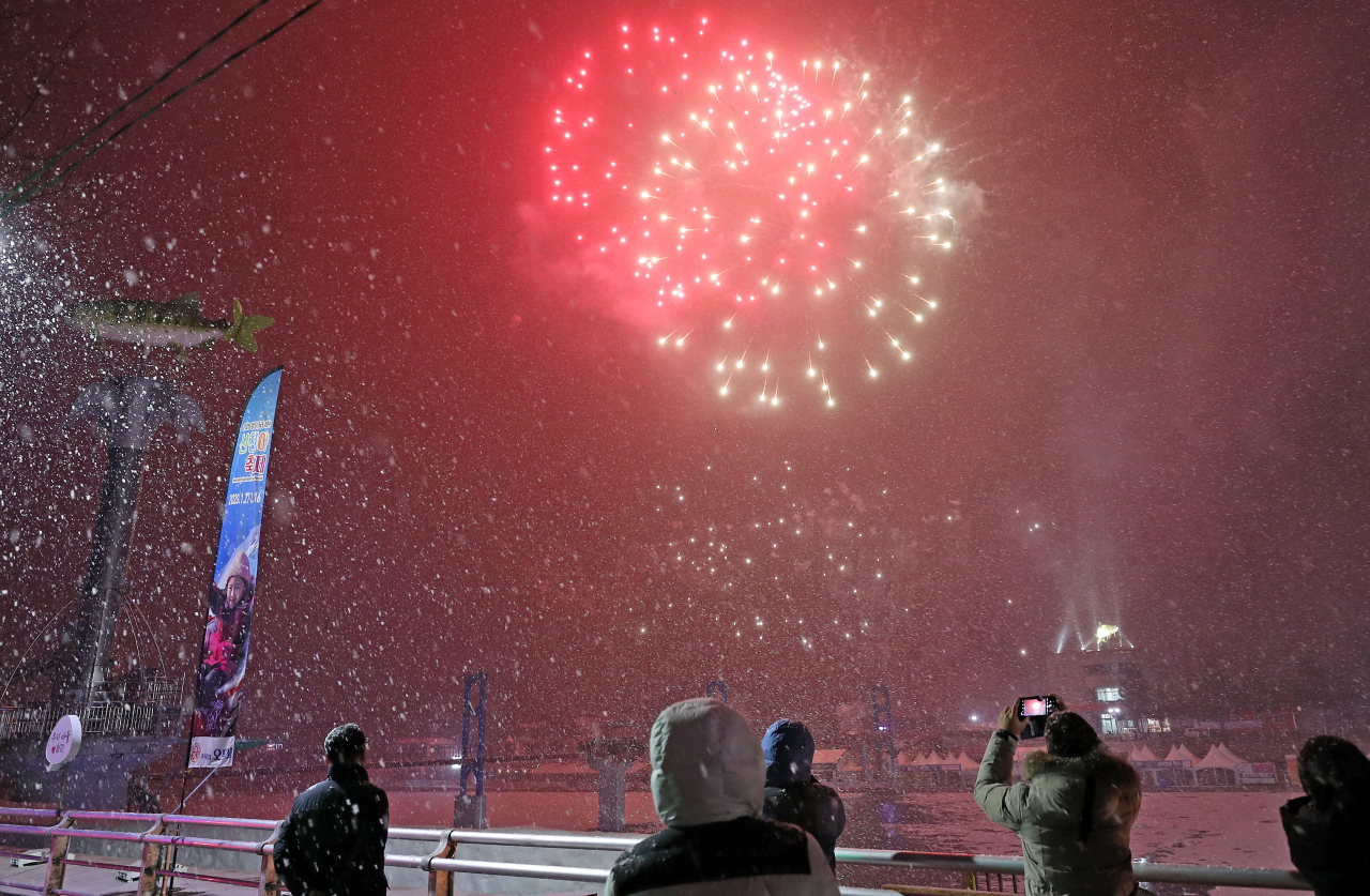 | 국내 대표 겨울축제인 산천어축제가 폐막한 1일 오후 축제장인 강원 화천군 화천천에서 불꽃놀이가 펼쳐지고 있다.[연합] |