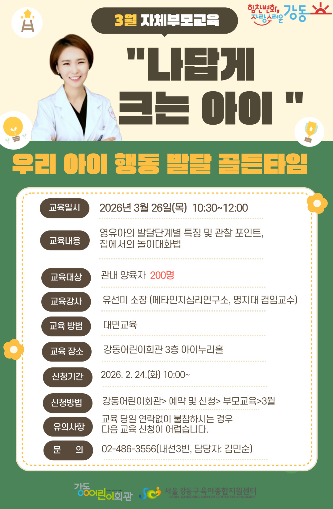 | 환하게 웃고 있는 유선미 강사의 사진과 함께 강동구 ‘나답게 크는 아이’ 부모교육 안내가 적혀 있는 포스터이다. 포스터에는 교육일시 2026년 3월 26일, 교육대상 관내 양육자 200명, 교육장소 강동어린이회관 3층 아이누리홀 등의 정보가 기재되어 있다. |