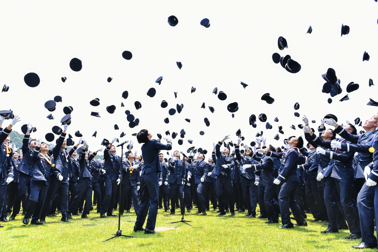 | 공군은 지난해 5월 27일 교육사령부 대연병장에서 손석락 교육사령관(중장) 주관으로 제154기 공군 학사사관후보생 임관식을 거행했다. 임관식을 마치고 모자를 하늘로 던지고 있는 공군 신임장교들. [공군 제공] |