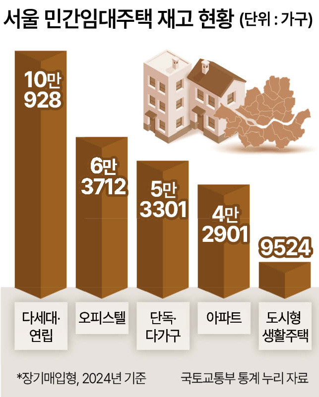국토교통부 통계누리에 따르면 2024년 기준 서울의 장기 매입 민간임대주택 재고는 총 26만9567가구로, 이 중 다세대·연립이 10만928호(37%)로 가장 많았다. 이어 오피스텔 6만3712호(24%), 단독·다가구 5만3301호(20%), 아파트 4만2019호(16%), 도시형생활주택 9524호(3%) 순이다.