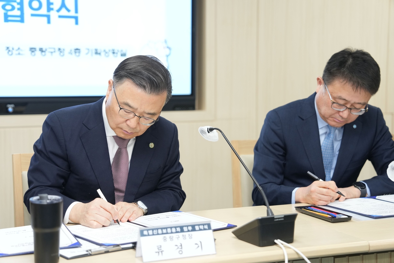 | 탁자 앞에서 류경기 중랑구청장을 포함한 두 명의 남성이 서류에 서명하고 있는 사진이다. 사진 상단에는 ‘협약식’이라는 텍스트가 있고, 그 아래에는 ‘장소: 류경기청 4층 기획상황실’이라는 텍스트가 있다. |