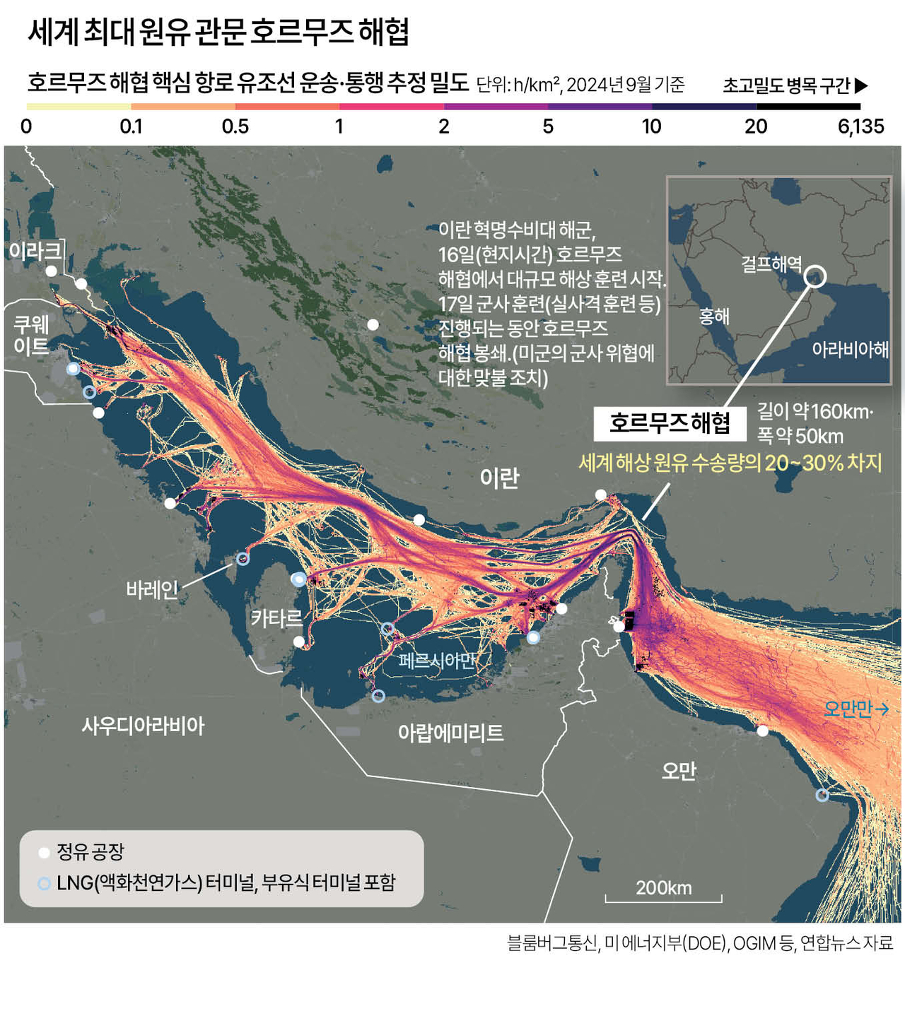 호르무즈 해협은 전 세계 석유 및 천연가스(LNG) 물동량의 약 20~25%가 통과하는 요충지다. 이곳에 기뢰를 매설하면 이란에도 타격이 크지만, 미 해군력을 효율적으로 견제할 수 있다.