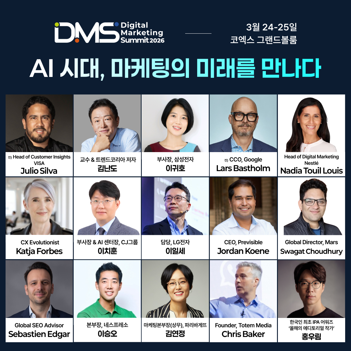지식 콘텐츠 플랫폼 기업 디엠케이글로벌(DMK Global, 대표 박세정)은 오는 3월 24일과 25일 양일간 서울 코엑스 그랜드볼룸에서 ‘디지털 마케팅 서밋 2026(Digital Marketing Summit 2026, 이하 DMS 2026)’을 개최한다. 올해로 11주년을 맞은 DMS는 매년 글로벌 석학과 브랜드 리더들이 참여해 한국 마케팅 업계의 연간 전략을 정렬하는 무대로 자리매김 해왔으며, 올해는 총 60여 개 세션과 80명 이상의 연사, 40여 개 마케팅 테크 전시 부스가 참여하는 역대 최대 규모로 열린다.