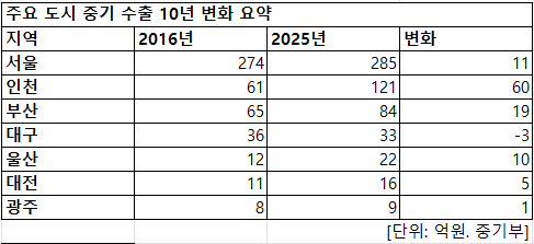 서울은 274억원에서 285억원으로 10년간 11억원 늘어나는 데 그쳤다. 2021년 287억원을 찍은 뒤 다시 250억~270억원대로 내려앉았다가 최근 회복됐다. 부산과 울산은 완만한 상승 흐름이었다. 부산은 2016년 65억원에서 2025년에는 84억원으로 늘었고, 같은 기간 울산은 12억원에서 22억원으로 확대됐다.
