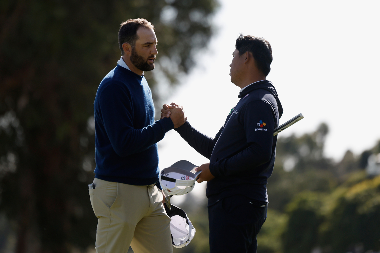 | 20일(현지시간) 미국 LA 리비에라 컨트리클럽에서 열린 제네시스 인비테이셔널 골프대회 2라운드에서 18번 홀 그린 퍼트를 마친 한국의 김시우와 세계랭킹 1위 스코티 셰플러가 악수를 나누고 있다. [AP] |