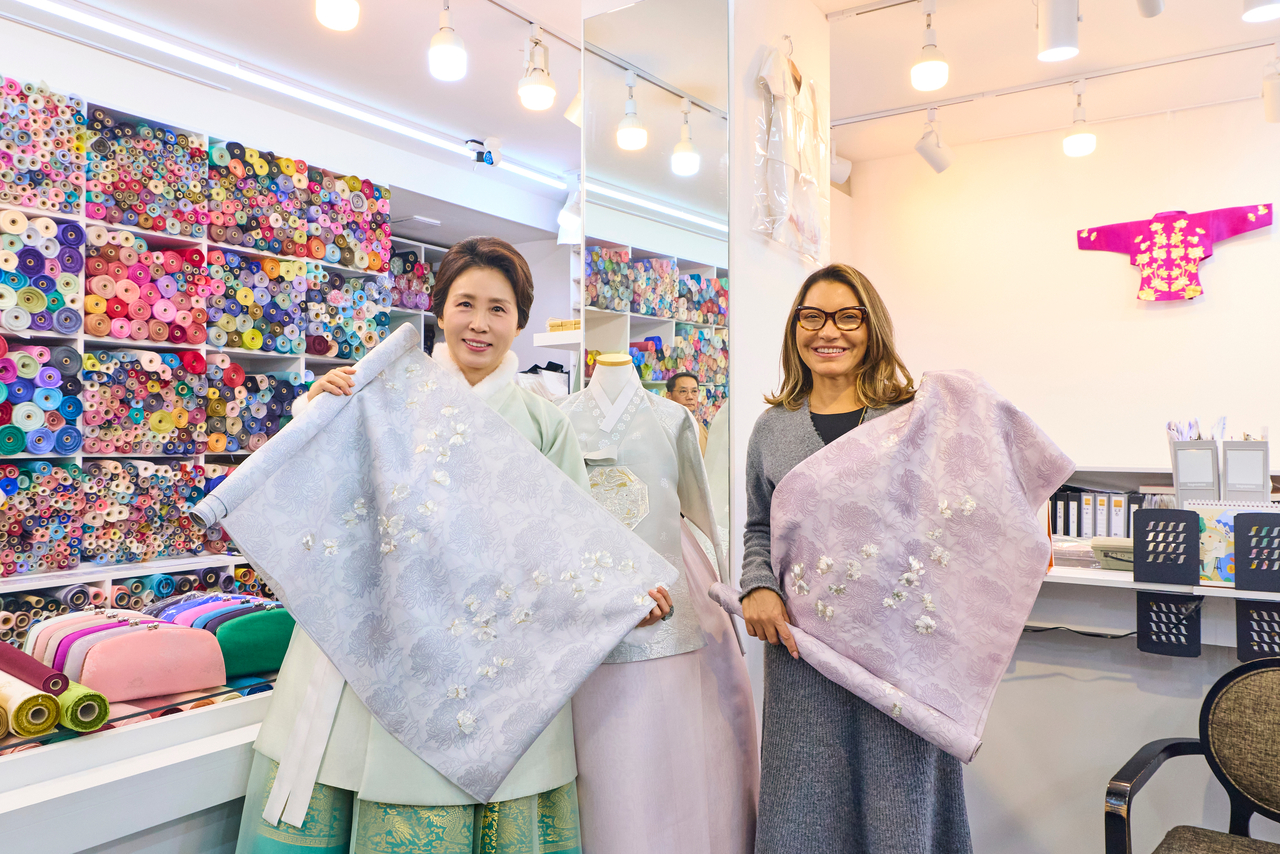 잔자 여사가 분홍빛 원단을 고르자 김 여사는 “한국에서는 결혼식 때 양가 어머니들이 한복 색을 커플로 맞춰 입기도 한다”며 같은 문양의 다른 색의 원단을 골랐다.