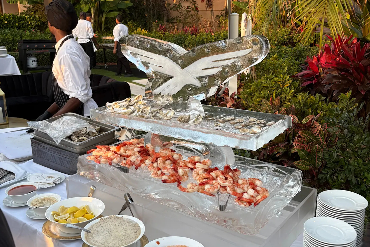 | 월드 리버티 파이낸셜(World Liberty Financial) 로고가 새겨진 얼음 조각에 담아 제공되는 칵테일 새우와 굴[FT] |
