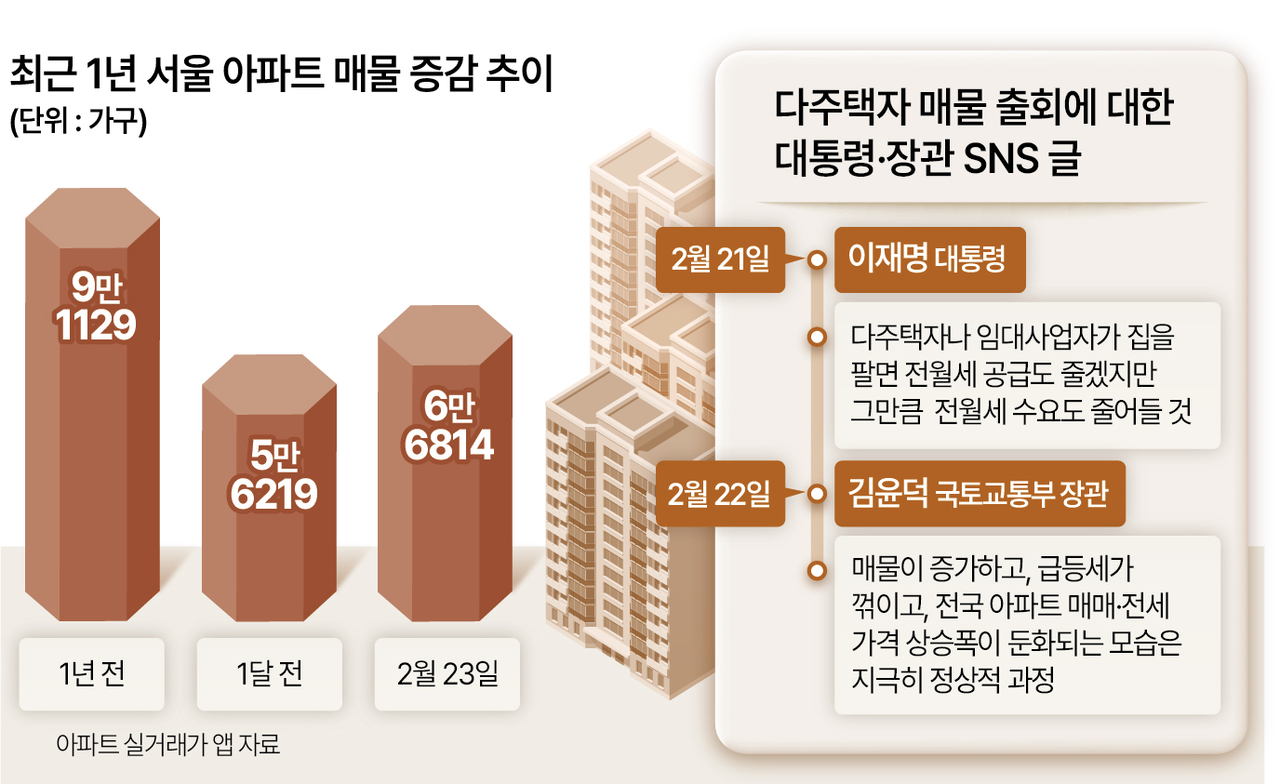 23일 아파트 실거래가 애플리케이션(앱)에 따르면 이날 기준 서울 아파트 매물 수는 6만6814가구로, 한달 전 1월 23일(5만6219가구)와 비교해 18.8% 증가했다. 이재명 대통령이 다주택자와 임대사업자 등에 대한 세금·대출 규제 강화 발언을 잇달아 내놓자 보유 주택을 매도하려는 집주인이 증가한 영향으로 분석된다.