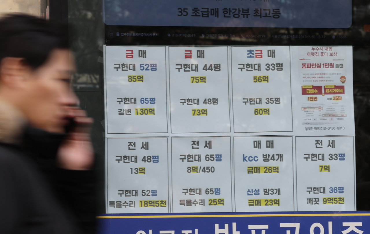 | 22일 서울 강남구 한 부동산중개업소에 급매, 초급매 등 아파트 매매 물건이 표시돼있다. [연합] |