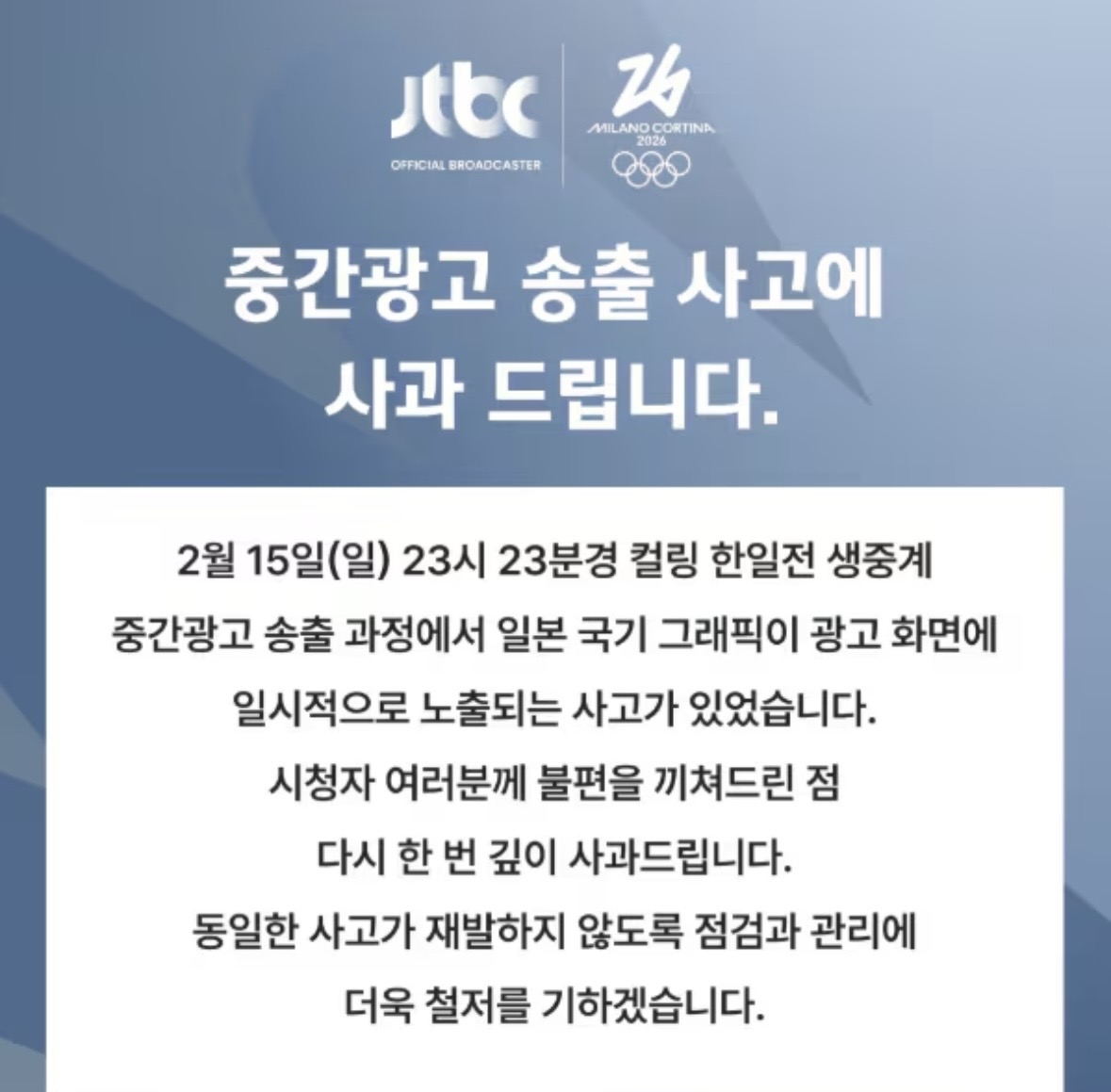 JTBC는 지난 16일 홈페이지에 사과문을 올려 “15일 오후 11시 23분경 컬링 한일전 생중계 중간 광고 송출 과정에서 일본 국기 그래픽이 광고 화면에 일시적으로 노출됐다”며 “제작진 과실로 시청자들에게 불편을 끼친 점에 대해 사과드린다”고 밝혔다. JTBC는 재발 방지를 약속했지만 단독 중계 체제에서 발생한 방송 사고라는 점에서 시청자 불만이 더욱 커졌다.