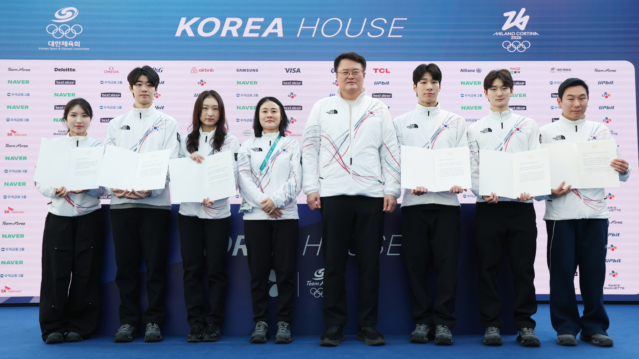| 쇼트트랙 대표팀 선수 및 코치들이 이탈리아 밀라노 코리아하우스에서 김대현 문화체육관광부 제2차관으로부터 이재명 대통령의 축전을 전달받은 뒤 기념사진을 찍고 있다. [연합] |