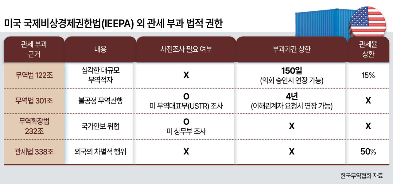 트럼프 대통령은 지난 20일 대법원 판결 직후 무역법 122조에 근거해 전 세계에 10%의 ‘글로벌 관세’를 부과한다는 포고문에 서명했다. 이어 21일에는 이를 15%로 인상하겠다고 엄포를 놨다. 무역법 122조는 대통령이 국제수지 문제에 대응하기 위해 최장 150일간 최대 15%의 관세를 부과할 수 있도록 규정하고 있다. 150일 이후에도 조치를 유지하려면 의회의 연장 승인이 필요하다.