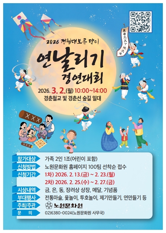 | 2026년 정월대보름맞이 연날리기 경연대회 포스터 사진이다. 포스터에는 연을 날리는 사람들과 윷놀이를 하는 가족들의 그림이 그려져 있다. |