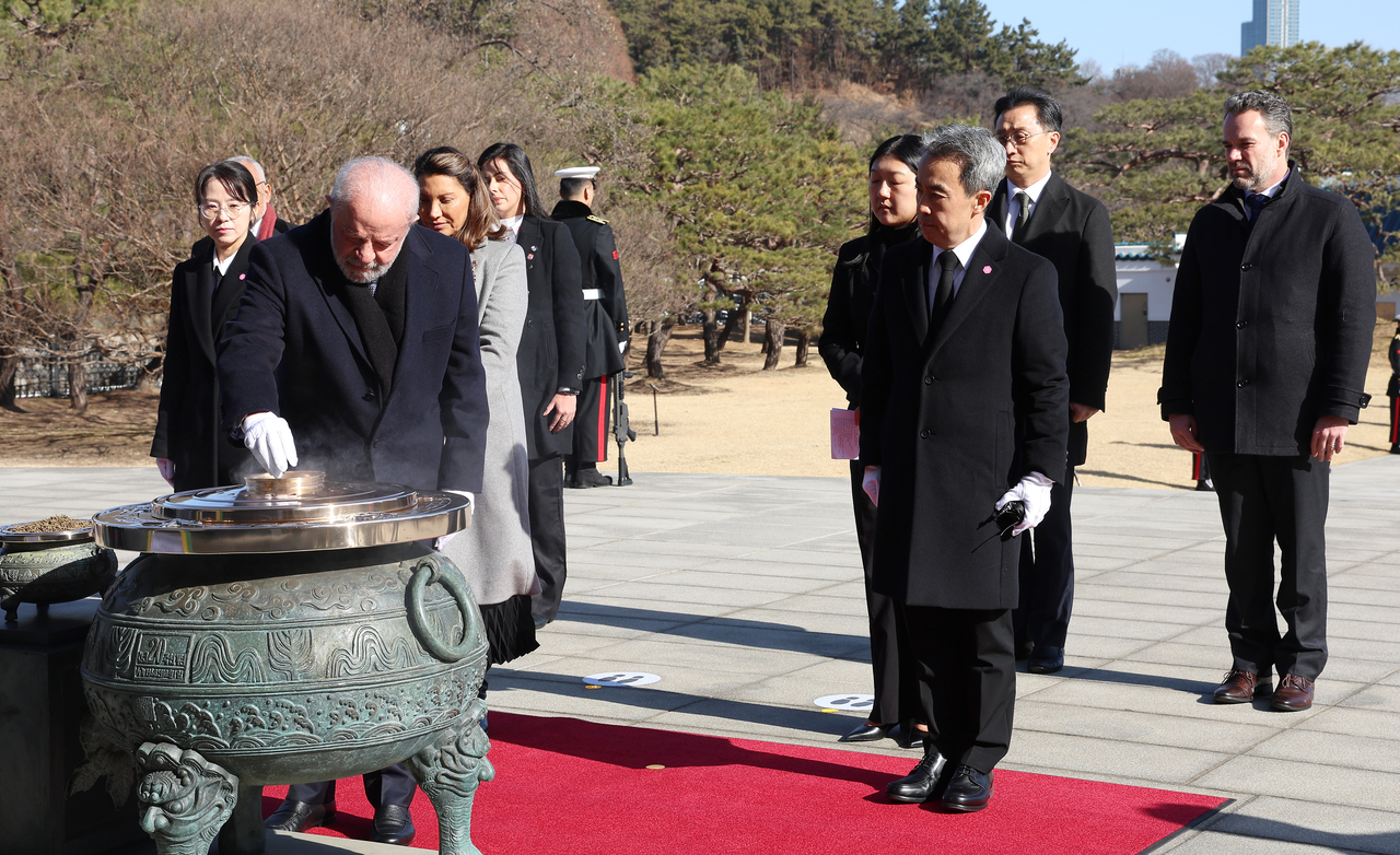 | 국빈 방한한 루이스 이나시우 룰라 다시우바 브라질 대통령 내외가 23일 서울 동작구 국립서울현충원을 방문해 분향하고 있다. [연합] |