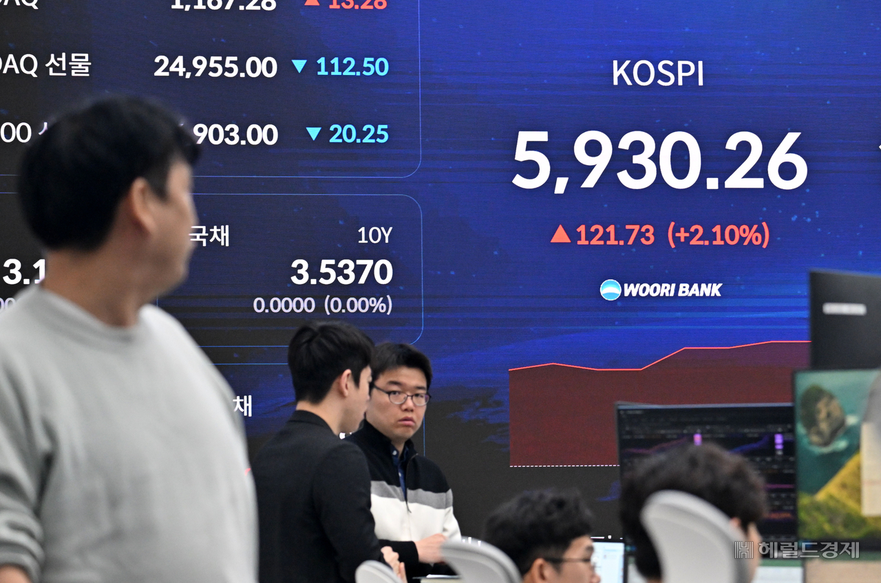 [헤럴드pic] 코스피 5900 돌파 글꼴 선택 본문 텍스트 크게본문 텍스트 작게 인쇄 [헤럴드경제=임세준 기자] 코스피가 23일 개장과 동시에 5900선을 넘어섰다. 미국 연방대법원의 관세 무효 판결로 인한 불확실성 완화 및 뉴욕증시 강세 마감의 영향으로 풀이된다. 이날 오전 서울 중구 우리은행 딜링룸 전광판에 코스피 지수가 표시되어 있다. 임세준 기자