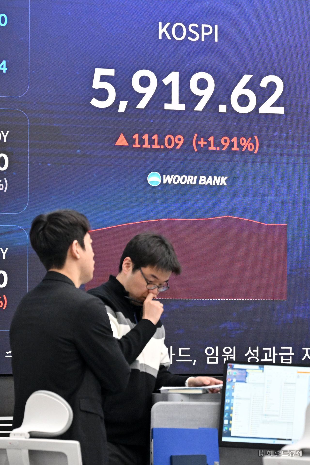 [헤럴드pic] 5900선 돌파한 코스피 글꼴 선택 본문 텍스트 크게본문 텍스트 작게 인쇄 [헤럴드경제=임세준 기자] 코스피가 23일 개장과 동시에 5900선을 넘어섰다. 미국 연방대법원의 관세 무효 판결로 인한 불확실성 완화 및 뉴욕증시 강세 마감의 영향으로 풀이된다. 이날 오전 서울 중구 우리은행 딜링룸 전광판에 코스피 지수가 표시되어 있다.