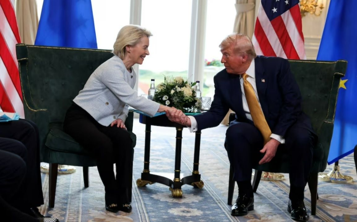 | 도널드 트럼프 미국 대통령(오른쪽)이 지난해 7월 영국 스코틀랜드 턴베리에서 우르줄라 폰데어라이엔 유럽연합 집행위원회 위원장을 만나 악수하고 있다.[로이터] |