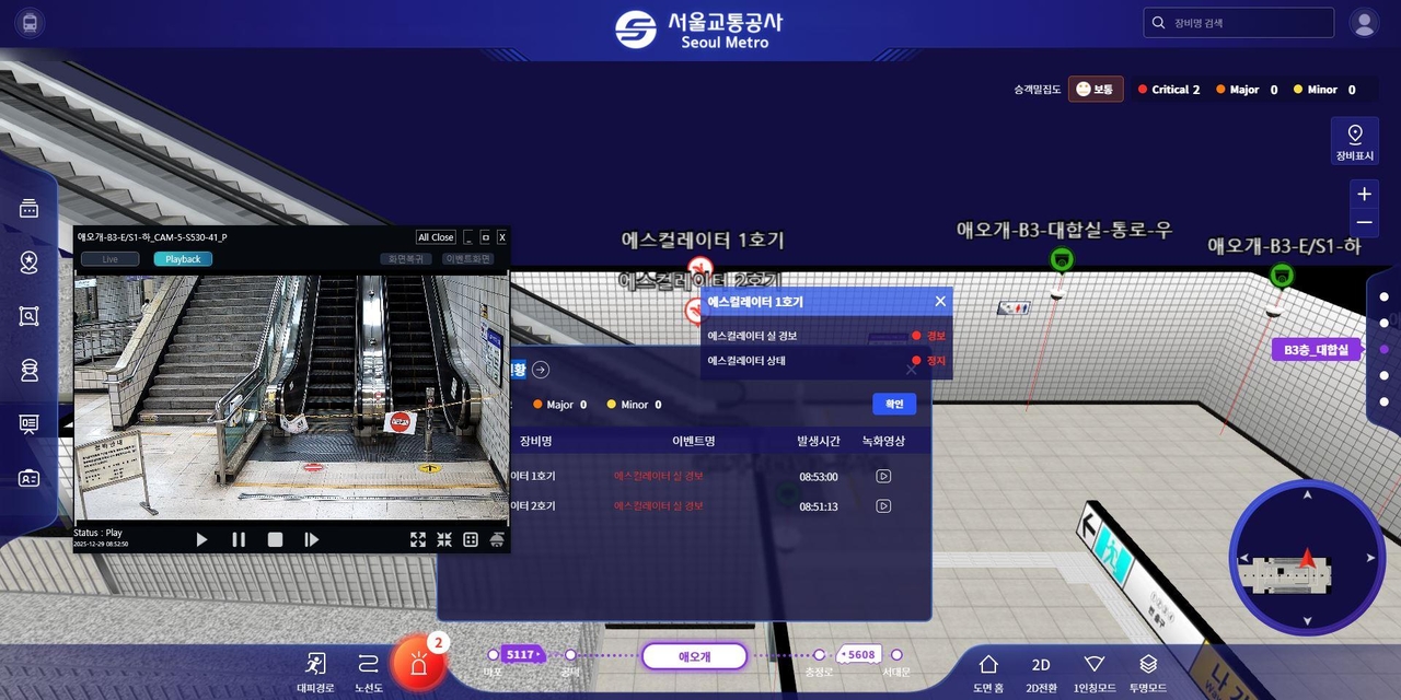 또한 디지털트윈 기반의 3D맵을 통해 역사 내부가 3차원 지도로 구현되어 있어 화재 발생 시에는 해당 위치 CCTV와 연동해 화재 위치와 CCTV 영상과 함께 표준대응절차(SOP)를 동시에 제공해 초동 대응 시간을 크게 단축한다.