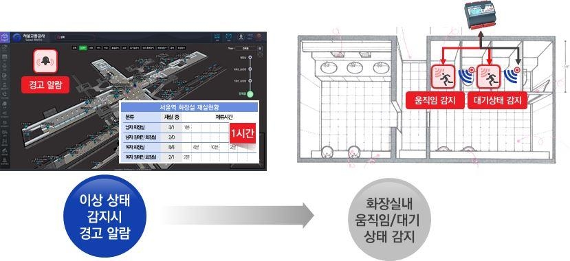 | 서울교통공사의 스마트 스테이션 시스템 화면을 촬영한 사진이다. 화면은 3차원 지도와 화장실 내부 도면을 보여주고, ‘이상 상태 감지 시 경고 알람’과 ‘화장실 내 움직임 및 대기 상태 감지’라는 텍스트가 있다. |