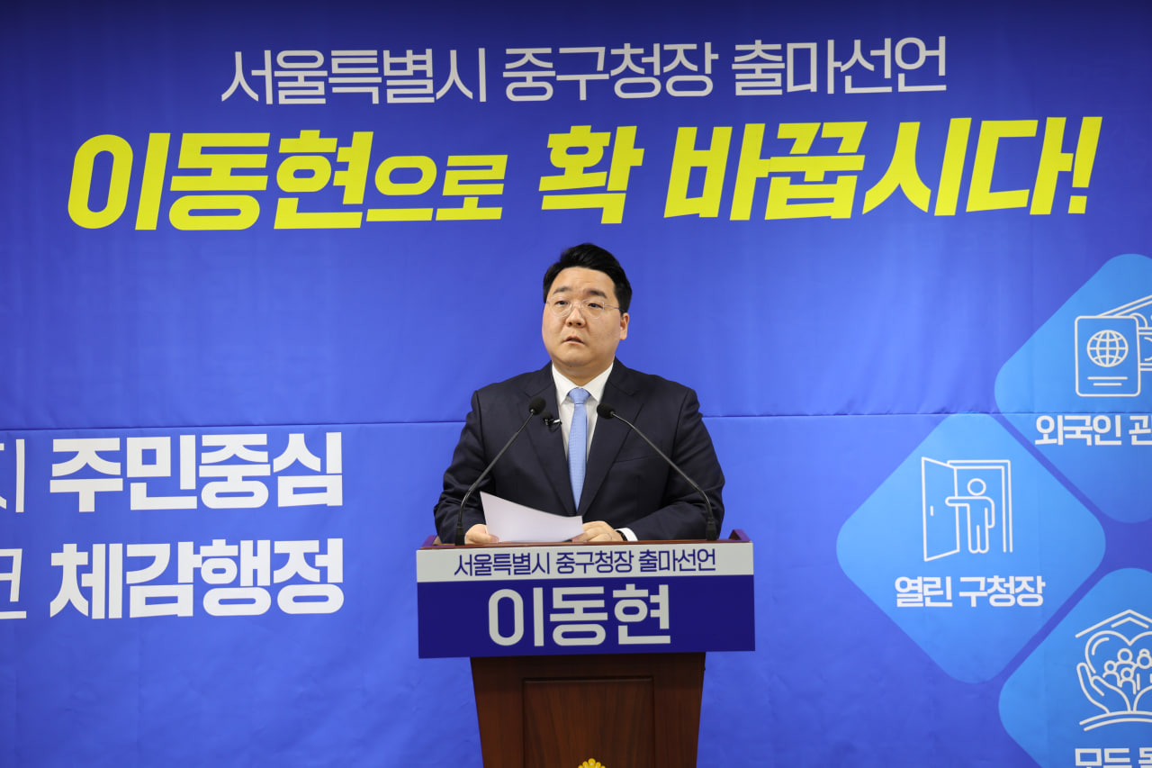 [헤럴드경제=박종일 선임기자]더불어민주당 이동현 서울 중구청장 예비후보가 23일 오전 10시 서울특별시의회 별관 기자회견장에서 서울 중구청장 출마를 공식 선언했다.