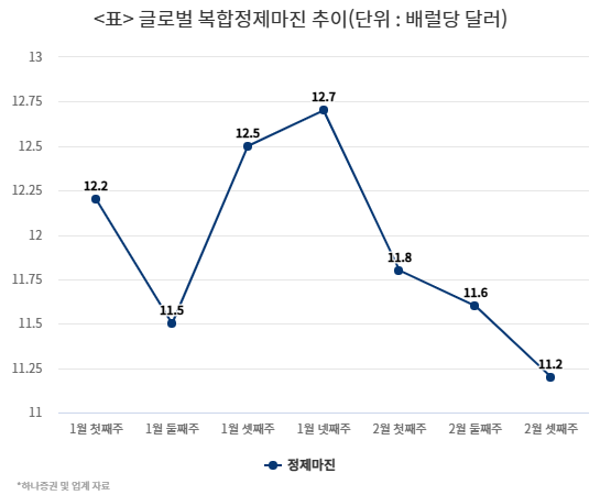 23일 하나증권 등에 따르면 이달 3째주 복합 정제마진은 배럴당 11.2달러이다. 1월 4째주 12.7달러를 기록한 이래 3주 연속 하락했다. 정제마진은 석유제품 가격에서 원료인 원유의 가격과 수송비 등을 제외한 값이다. 업계에서는 정제마진 손익분기점으로 5달러대로 분석하고 있다.