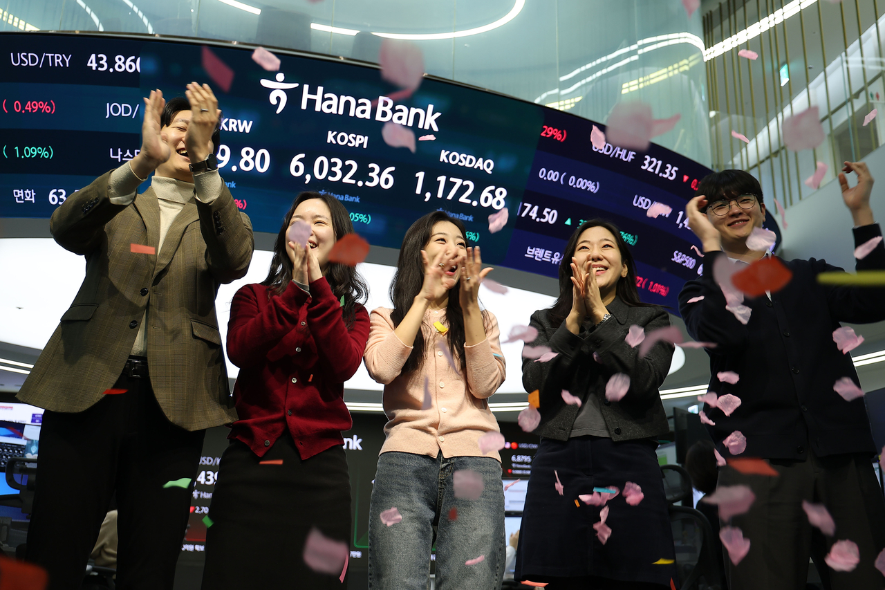 | 코스피 지수가 25일 장중 6000을 넘어선 가운데 이날 서울 중구 하나은행 본점 딜링룸에서 직원들이 기뻐하고 있다. [연합] |