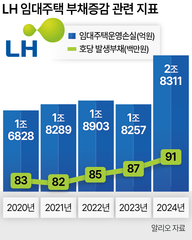 문제는 임대주택 사업을 할 수록 적자가 누적되는 구조에 있다. 공공기관 경영정보시스템인 알리오에 따르면 LH의 임대주택 운영손실은 2020년 1조6828억원, 2021년 1조8289억원, 2022년 1조8903억원, 2023년 1조8257억원을 기록하다 2024년엔 2조8311억원까지 치솟았다.