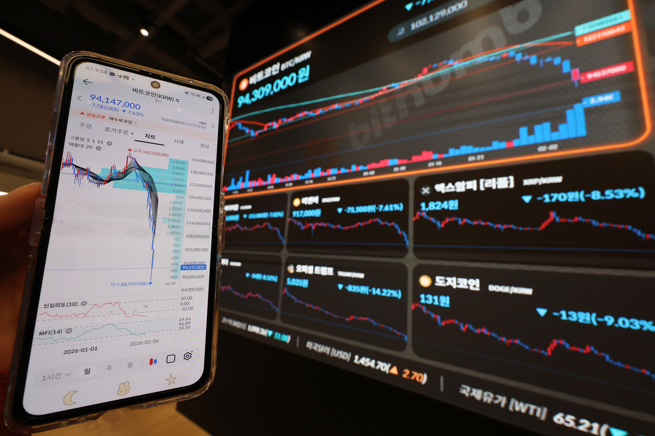 | 서울 강남구 빗썸 라운지 전광판에 비트코인 시세가 표시돼 있다. [연합] |