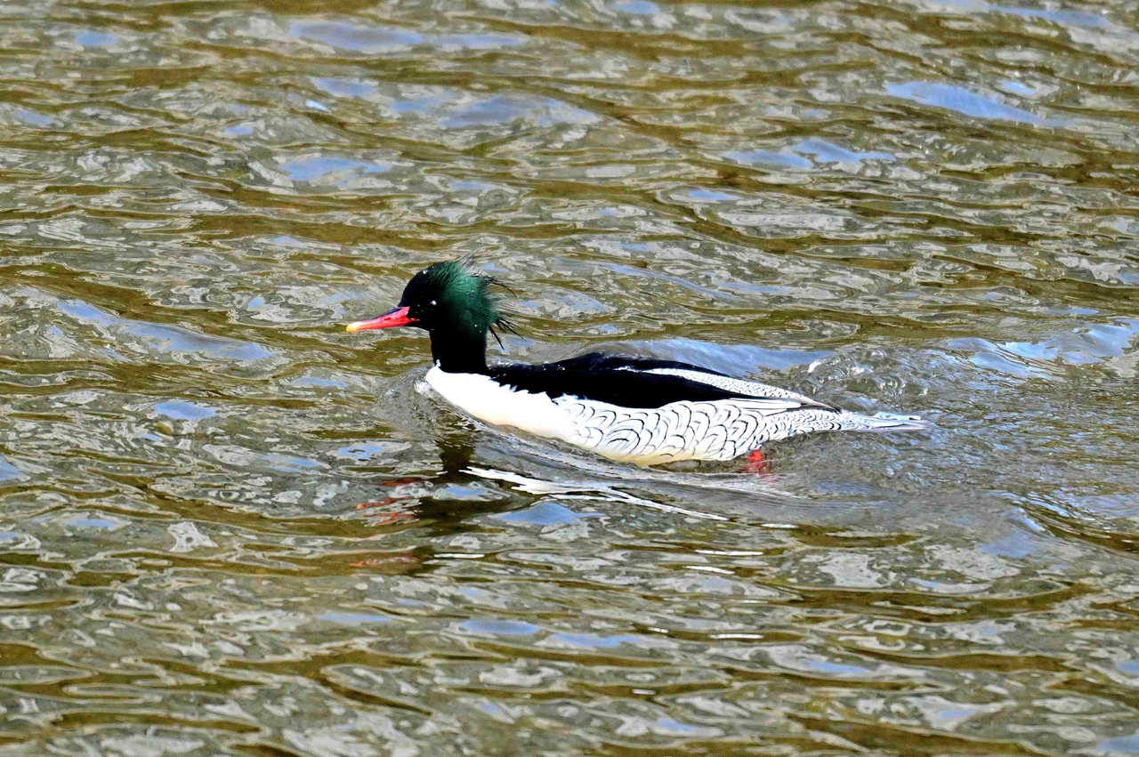 | 중랑천에 호사비오리 한 마리가 떠 있는 모습이다. 호사비오리는 검은색 머리와 흰색, 검은색, 회색이 섞인 몸통을 가지고 있다. |