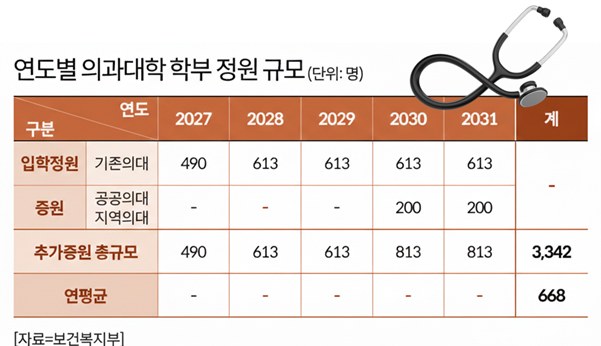 보건복지부가 지난 2월 10일 정부와 의료계 등이 참여하는 ‘보건의료정책 심의위원회’ 7차 회의를 열고 ‘지역의사제’를 통한 의대 증원방안을 확정했다. 이번 결정으로 2027년 의대정원이 기존보다 490명 늘어난 3,548명을 선발하고, 2031년까지 매년 613~813명 수준을 증원할 계획이다.