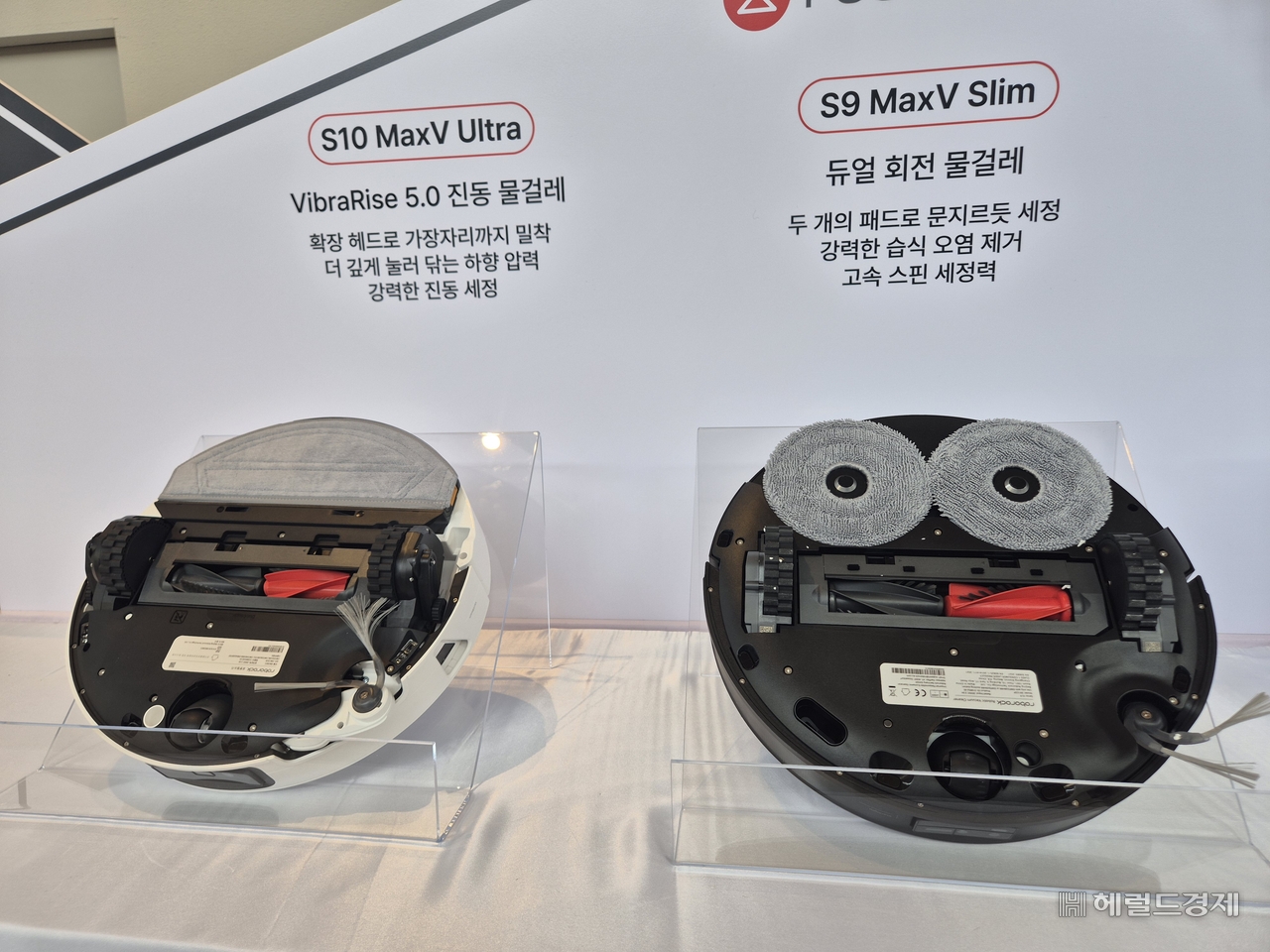 | 로보락은 26일 서울 성수동 코사이어티에서 열린 ‘2026 신제품 론칭쇼’에서 신제품 ‘S10 맥스V 울트라’(왼쪽)를 공개했다. 반원 형태의 물걸레 패드의 움직이는 영역은 전작보다 27% 더 넓어졌고 바닥을 누르는 압력은 1.75배 강화됐다. 김현일 기자 |