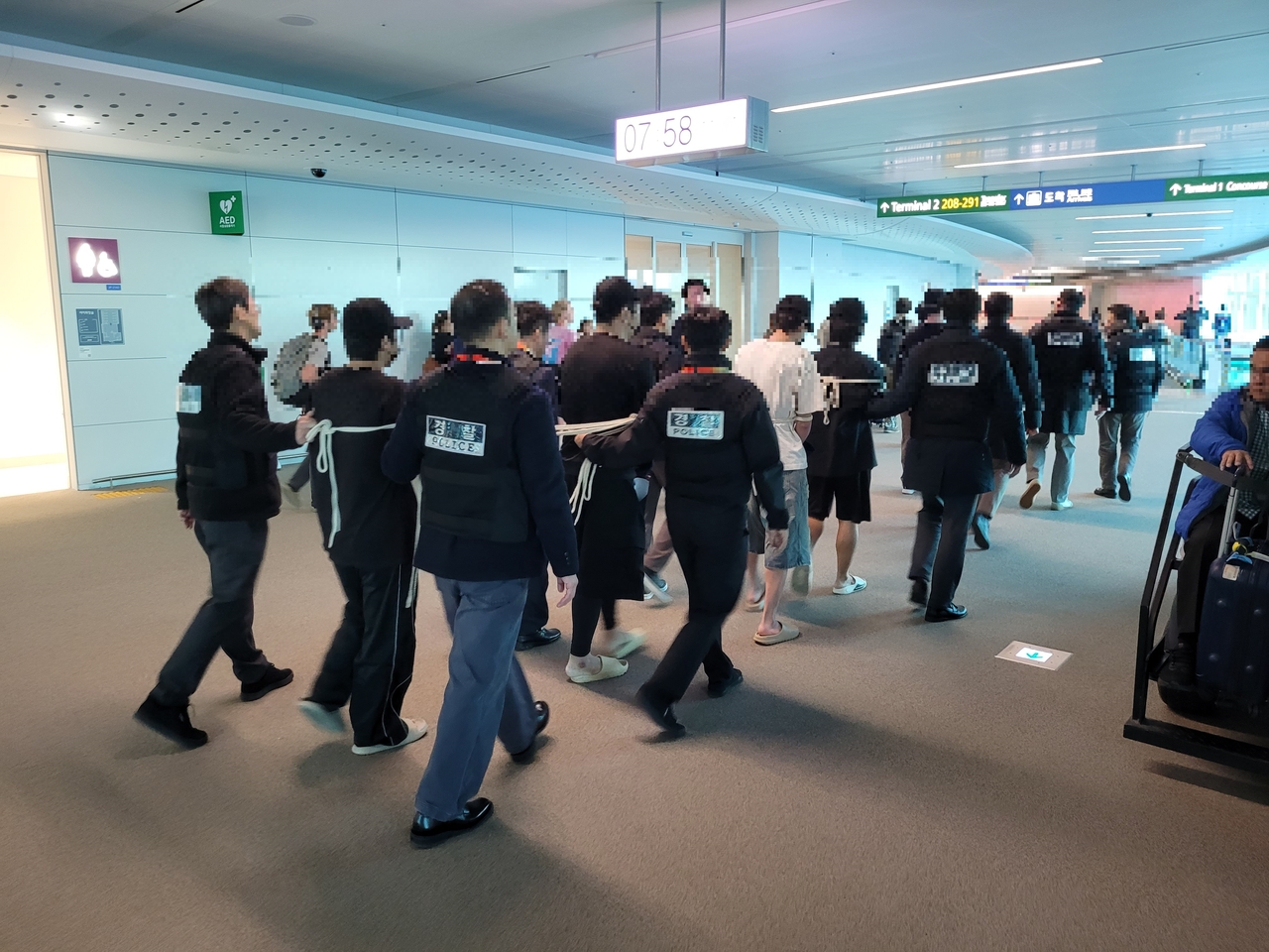 | 인천공항에서 압송된 캄보디아 사기 피의자들. [서울경찰청 제공] |