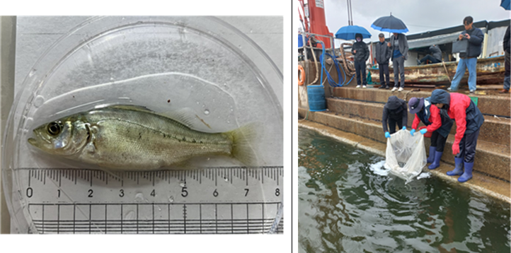 | 점농어(왼쪽)와 지난해 영도구 연안수역에서 점농어 방류 장면 [부산시 수산자원연구소 제공] |