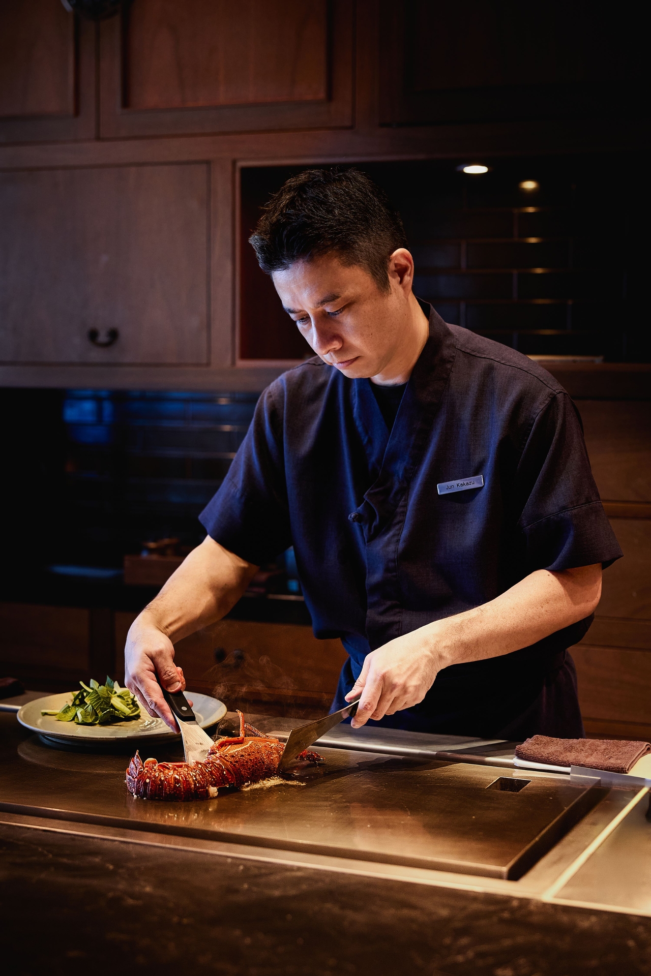 테판야키 오마카세는 셰프가 철판 위에서 즉석으로 재료를 조리하는 일본 전통 철판요리다. 하루 12인 한정(1회 4인, 총 3회)으로 운영된다. 7코스와 9코스로 구성되며 가격은 각각 1인 20만원, 31만원이다.