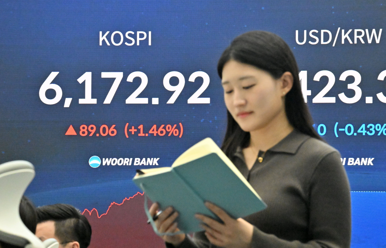 | 코스피 지수가 26일 상승 출발해 6100선을 다시 회복했다. 이날 오전 서울 중구 우리은행 딜링룸 전광판에 코스피 지수가 6170선을 기록하고 있다. 임세준 기자 |