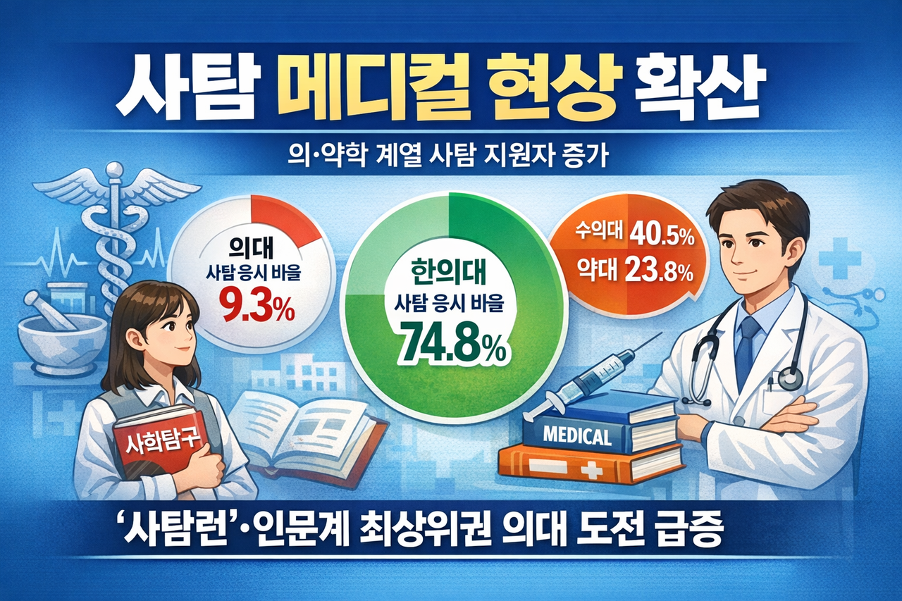 | 2026학년도 정시가 마무리되는 가운데 의대에 지원한 사회탐구(사탐) 응시자의 지원 비율이 10%에 육박해 ‘사탐 메디컬 현상’이 현실화된 것으로 파악됐다. 기사를 분석해 AI가 제작한 그림. [챗GPT를 통해 제작] |