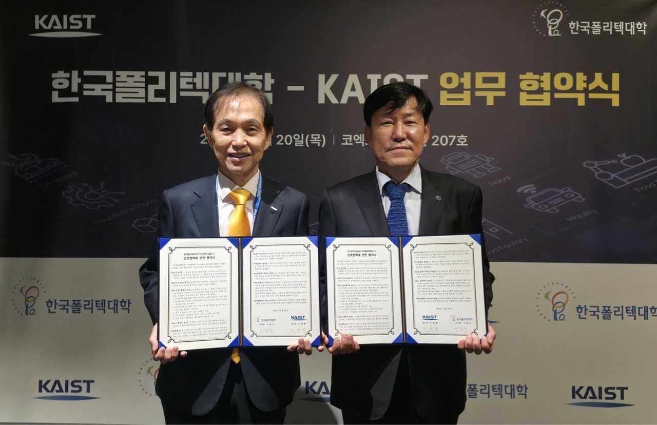 | 지난해 11월 한국폴리텍대학 이철수 이사장(오른쪽)과 한국과학기술원 이광형 총장(왼쪽)이 ‘AI 분야 전문인력 양성 및 기술교류 활성화’를 위한 업무협약을 체결했다. [한국폴리텍대학 제공] |