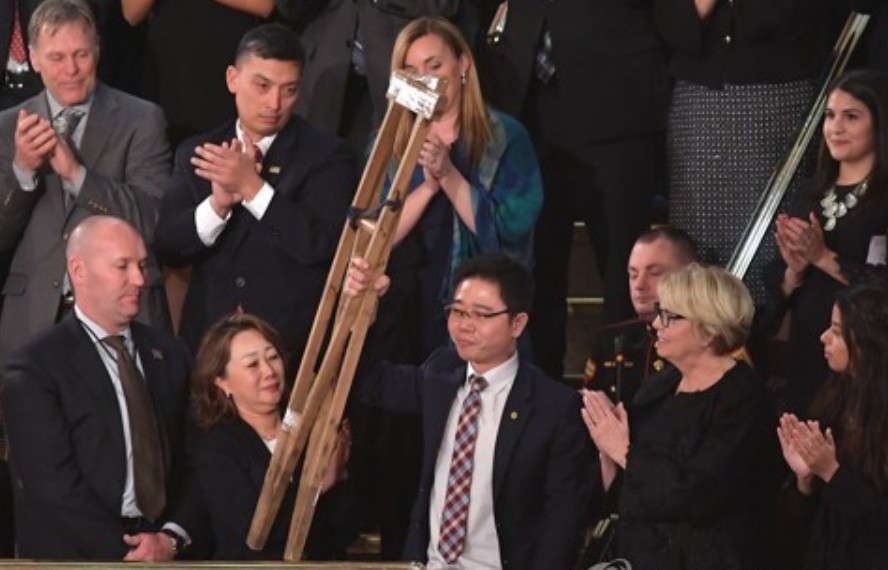 | 트럼프 대통령이 2018년 1월 국정연설 도중 소개한 지성호 지사. 그는 북한에서 크게 다쳐 왼쪽 손과 무릎 아래를 잃었고 한국에 와서 의족과 의수를 얻었다. [AFP=연합] |