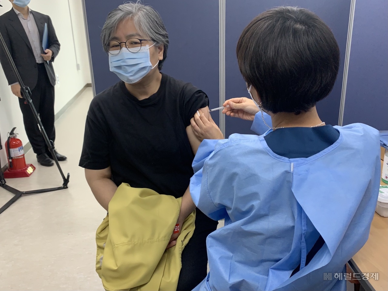 | 정은경 당시 질병관리청장이 지난 2021년 11월 19일 충북 청주 의료기관에서 모더나社 코로나19 백신을 추가 접종하고 있다. 김아린 기자 |