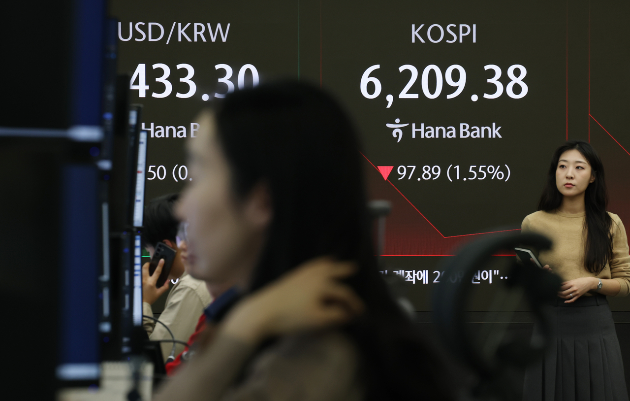 | 27일 오전 중구 하나은행 본점 딜링룸 전광판에 실시간 코스피가 표시돼 있다. 이날 코스피는 전장보다 109.78포인트(1.74%) 내린 6197.49로 출발했다. [연합] |